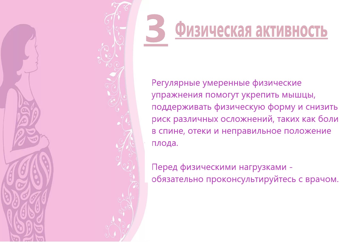 Чтобы дать ребенку правильное развитие и крепкое здоровье, маме нужно соблюдать определенные правила по физической активности, питанию, сну и отказу от вредных привычек.