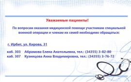 © 2012 Государственное автономное учреждение здравоохранения Свердловской области «Ирбитская центральная городская больница» Россия, Свердловская обл., 623854, г. Ирбит, ул. Комсомольская, 72 Лицензия на право медицинской деятельности № ЛО-66-01-006441 выдана Минздравом Свердловской области 27.03.2020 бессрочно